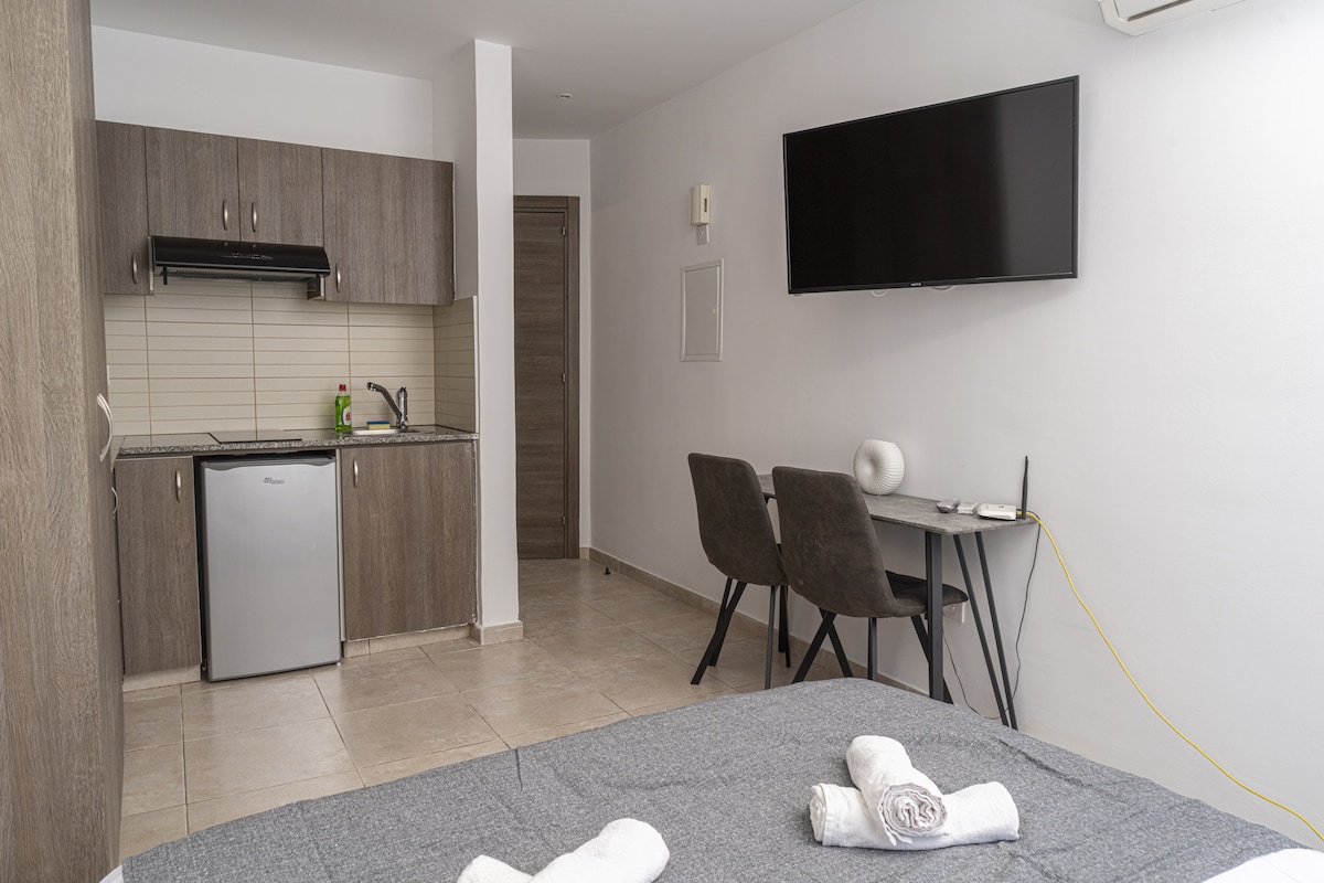 Un appartement propre et récemment rénové situé dans un quartier sûr et calme, à 5 minutes à pied de la plage et à 3 minutes à pied de l'avenue principale. Vous trouverez tout ce dont vous avez besoin en quelques minutes à pied, y compris les cafétérias, les restaurants, les supermarchés, les magasins et les boîtes de nuit. Se compose d'une chambre double et d'une chambre simple, d'un salon, d'une table haute pour quatre personnes, d'une cuisine entièrement équipée, de toilettes avec douche et d'une grande véranda à l'extérieur. Convient aux amis, aux couples et aux familles.