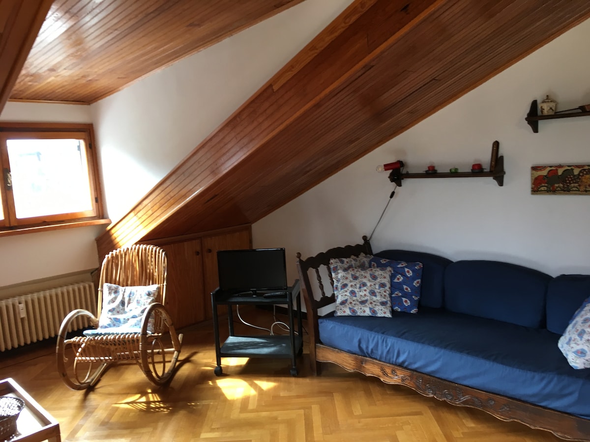 Appartement mansardé avec vue spectaculaire sur le dernier étage avec ascenseur d'un complexe privé des années 70 avec concierge. L’ascenseur s'arrête au quatrième , la dernière rampe pour arriver au cinquième doit être faite à pied : entrée, kitchenette, grande pièce avec coin repas, deux chambres et salle de bain avec baignoire. 5 lits avec la possibilité d'arriver à 8 par des lanières pliantes. parking en copropriété et garage. Devant le condo grand terrain privé avec ruisseau.