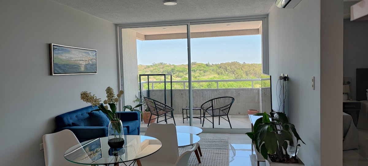 Appartement super équipé dans un quartier résidentiel, avec balcon et barbecue, belle vue et équipements premium : - Piscine avec solarium - Piscine chauffée - Sauna - Salle de sport en hauteur - Rooftop + Quincho - Laundry - Sécurité 24 h/24 - Garage Emplacement idéal : - À 7 minutes de l'Eje Corporativo, du Shopping del Sol et du Paseo La Galería - À 10 minutes de la Costanera et du pont Héroes del Chaco - À 15 minutes de l'aéroport Silvio Pettirossi Il dispose d'une connexion Wi-Fi, de Smart TV et de matelas fermes à haute densité