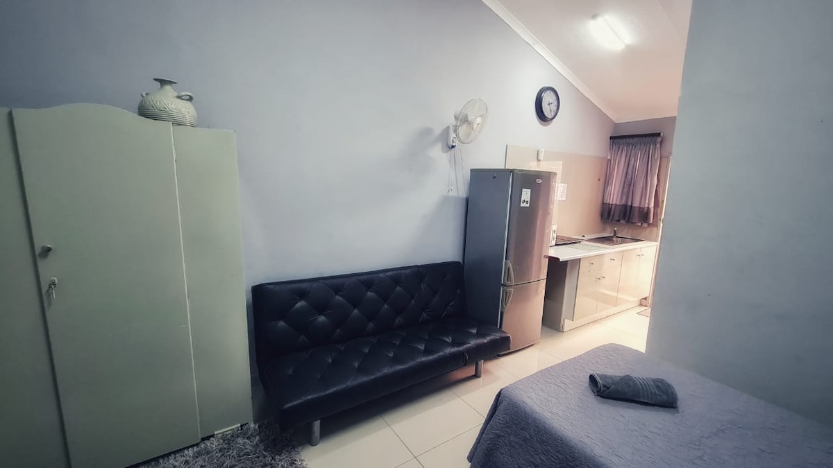 Chambre confortable avec salle de bains privative idéale pour une seule personne . Entrée privée, 3/4 lit + kitchenette avec micro-ondes et réfrigérateur , douche et toilettes , télévision avec forfait DSTV compact et parking sécurisé devant la chambre . Zone fermée,pas d'équipements partagés. Zone de braai communautaire dans le jardin