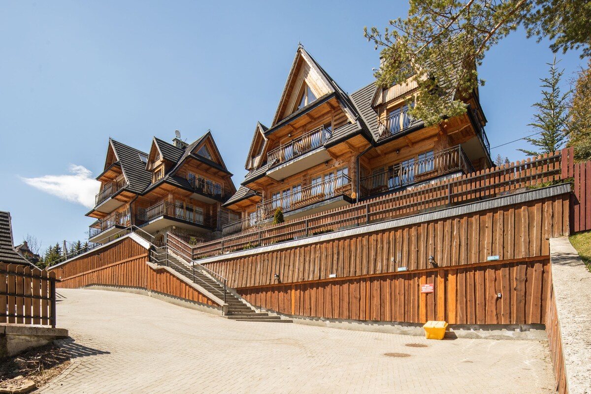 L'appartement est décoré dans le style Zakopane, qui allie highlander à modernité. De nombreux éléments d'escalade donnent l'ambiance de visites de haute montagne. À l'intérieur en bois et à côté de LA CHEMINÉE, vous pouvez sentir l'atmosphère des MONTAGNES environnantes. L'Appartement dispose D'UNE GRANDE TERRASSE AVEC UNE VUE MAGNIFIQUE SUR LES MONTAGNES DES TATRAS.