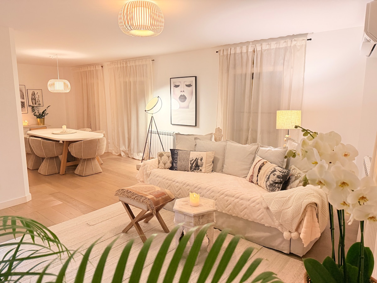 Appartement reconstruit par architecte, excellente intimité, exposition solaire, avec wifi et plage à 150m. 1 suite avec SPA et bain turc avec aromathérapie. 1 suite avec terrasse avec vue sur la mer, écran de projection de cinéma. Chambre avec vue sur la mer, rivière et terrasse, où vous pourrez profiter d'un coin salon et d'un barbecue avec un barbecue en fer forgé. Proche des restaurants, du café et du supermarché, et de la gare. Climatisation et plancher chauffant dans tous les espaces, TV 4K et box indépendant par suite.