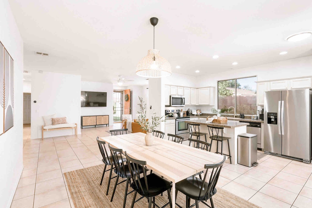 Our home sleeps four comfortably, with space for up to seven. Enjoy a king bedroom, queen bedroom, and office with a futon. A queen air mattress is available upon request prior to arrival. Two full bathrooms. Fully equipped kitchen with a smart fridge and Nespresso machine with pods, 60” TV, and a private backyard with patio. High speed 450 Mbps WiFi with 5G coverage included. Short drive to Camelback Ranch and Goodyear Ballpark, and 10 minutes to State Farm Stadium. Self check in.