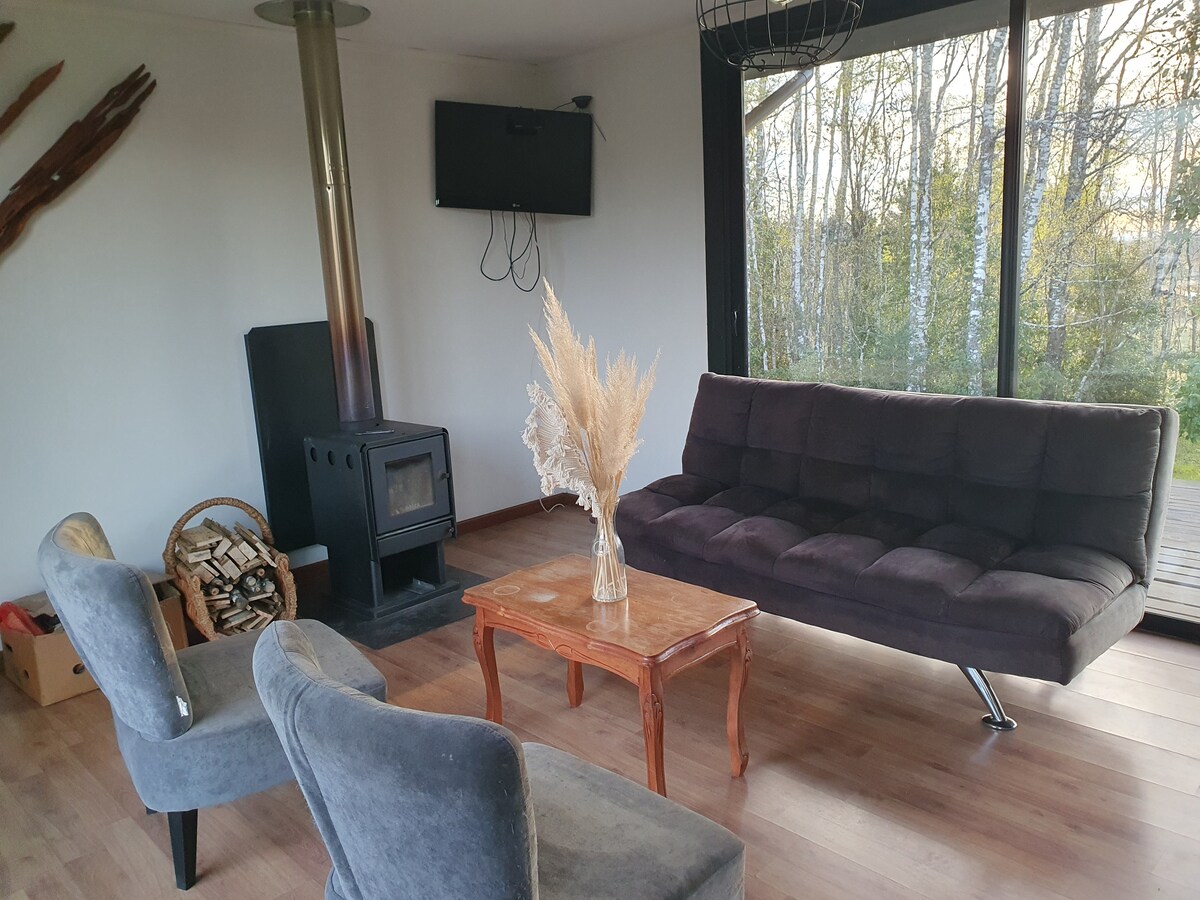 Belle cabane dans la forêt, située dans la région de Lefún entre Villarrica et Pucón. Il offre une vue imprenable sur le volcan Villarrica, entouré d'une forêt indigène et d'oiseaux. Chaque jour, vous pouvez entendre Loicas et Chucaos. Entièrement équipé pour profiter de votre séjour, vous déconnecter et vous détendre. Un joli ruisseau traverse la propriété. Nous vous recommandons de prendre des photos nocturnes du volcan Villarrica à côté du poêle à bois avec la vue panoramique de notre cabane. Nous sommes certains que vous allez adorer !