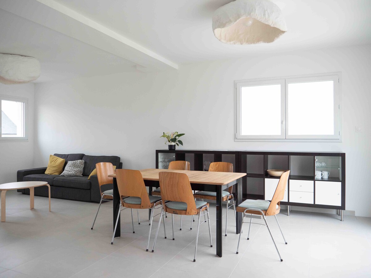 A 600m des plages et du GR34, 20 min de Brest, venez profitez de la Bretagne dans ce logement tout juste rénové, idéal pour 4 personnes. 2 chambres séparées avec lits de 140cm et 160 cm et rideaux occultants, 1 salle de douche avec WC, 1 cuisine équipée, 1 grande pièce à vivre de 35 mètres carrés. Vous profiterez également d'une terrasse avec table/parasol, d'un barbecue, d'un bout de jardin et d'une cour pour garer votre voiture. Equipements bébé sur demande. Draps et serviettes inclus.