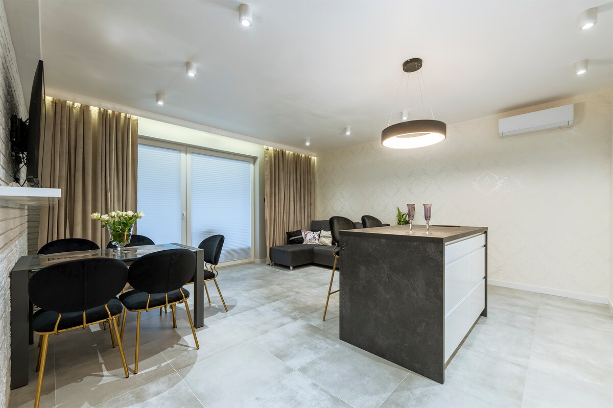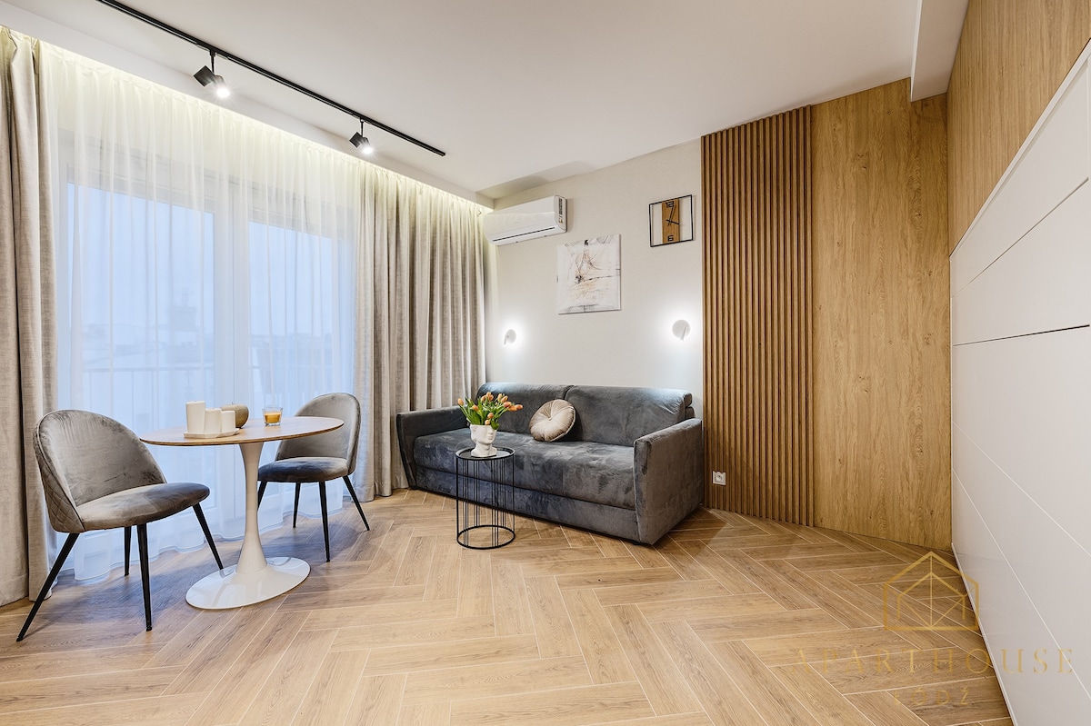 Appartement élégant au 1er étage d'un gratte-ciel moderne dans le centre de Łódź (23 Wigury Street). Une petite terrasse privée est disponible, parfaite pour le café du matin ou la détente en soirée. Il y a deux ascenseurs dans l'immeuble à partir du niveau 0. L'appartement a été conçu pour votre confort : vous trouverez une cuisine entièrement équipée avec un four et un lave-vaisselle, une connexion Wi-Fi rapide et un accès aux applications et programmes de télévision, le tout inclus dans le prix de votre séjour.