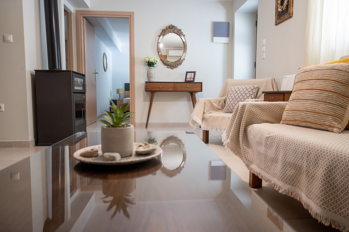 Un magnifique appartement au rez-de-chaussée avec une belle cour et une vigne au-dessus. Il y a aussi une vue sur la mer et l'appartement est entièrement équipé. Cet appartement traditionnel est à seulement 1,5 km de la mer et à proximité, vous trouverez un café, de la nourriture et des lieux anciens et byzantins à visiter. Je suis Kostas et je ferai de mon mieux pour que vous ressentiez l'hospitalité grecque.