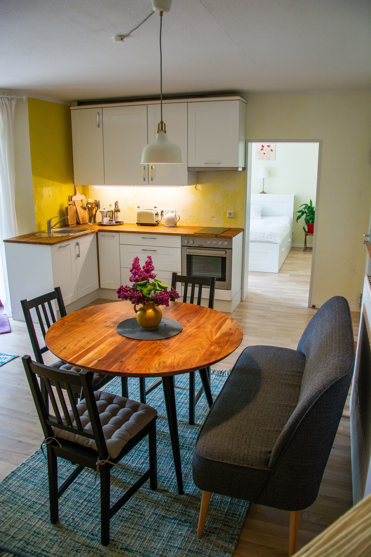 Tu habites dans un appartement en sous-sol confortable et très lumineux dans une maison en bois construite selon les directives de la biologie du bâtiment. L'appartement dispose de sa propre entrée, d'une belle terrasse et le jardin (bac à feu) peut également être utilisé. En plus d'une cuisine avec four et réfrigérateur, une machine à laver est également à disposition. La maison se trouve dans un quartier résidentiel calme avec des voisins sympathiques, la petite ville, avec de bonnes infrastructures, est accessible en cinq minutes à pied.