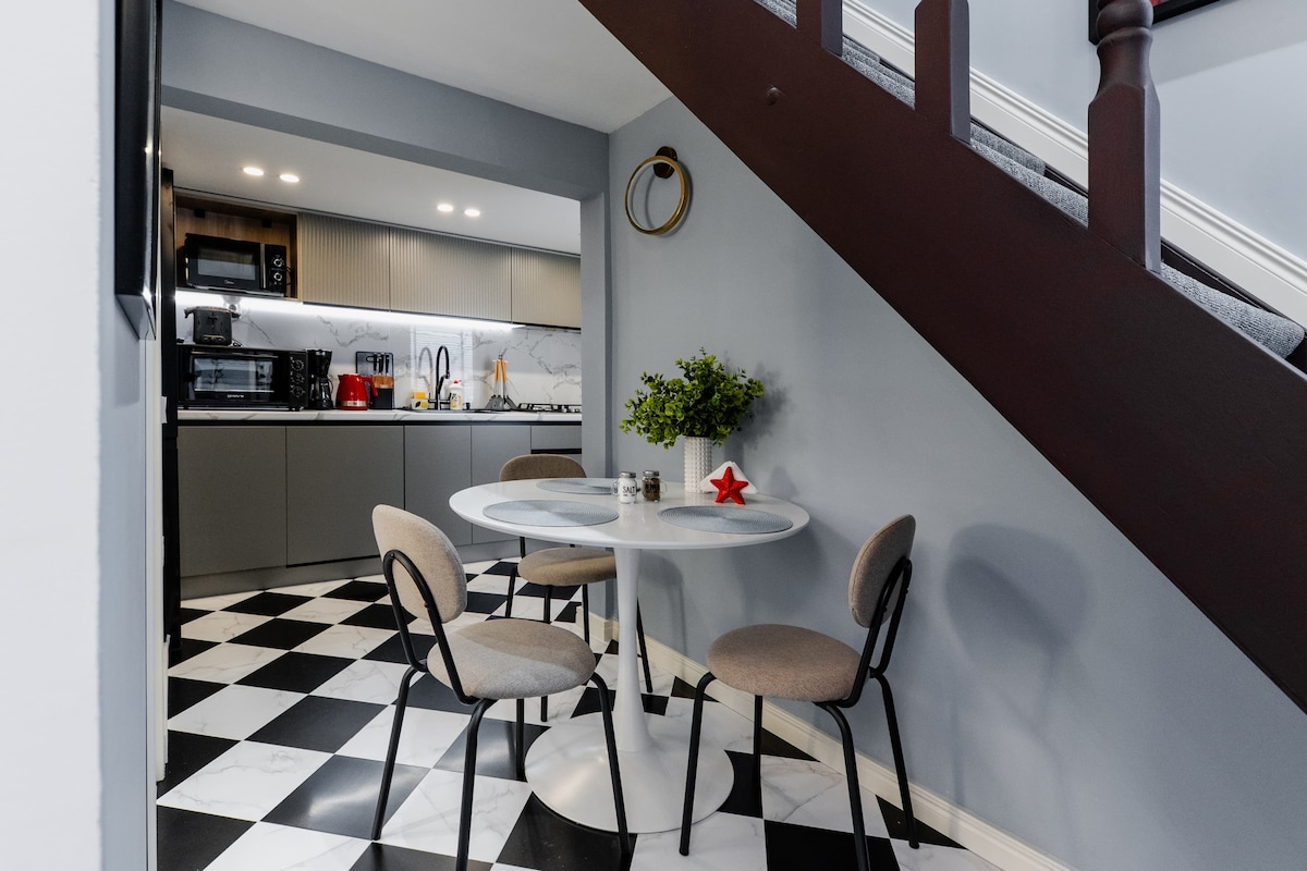 Whether you're traveling for work or as a tourist: this place has you covered. Our newly-renovated apartment was designed with comfort and practicality in mind. Soundproof walls will allow you to get a good night's rest. Heated floors will keep you warm in winter and the ACs will cool you down when it's hot outside. Those who like cooking will surely enjoy our spacious kitchen. There's a comfortable office chair and a desk for people that need to work from home. Looking forward to welcoming you!