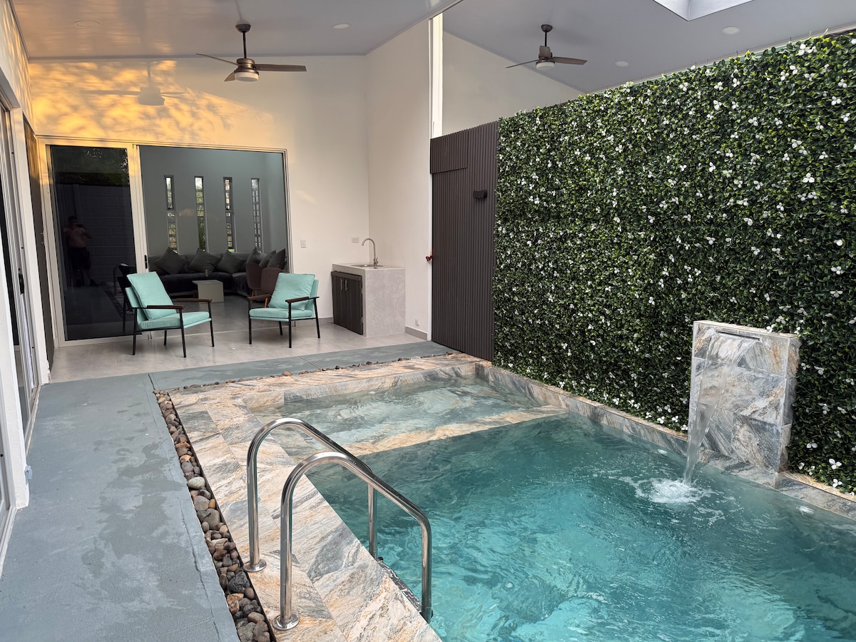 Al Mar by DeRide Escape to our completely private 350m² retreat, surrounded by magical trees and vibrant wildlife. Spot monkeys, birds, sloths, and butterflies in the lush backyard, now glowing at night with enchanting lights that transform the garden into a dreamy jungle. Unwind in the jacuzzi, sleep soundly in a cozy queen bedroom. With modern amenities and a serene vibe, it’s perfect for couples seeking romance, relaxation near stunning beaches. Stay here and experience the magic!