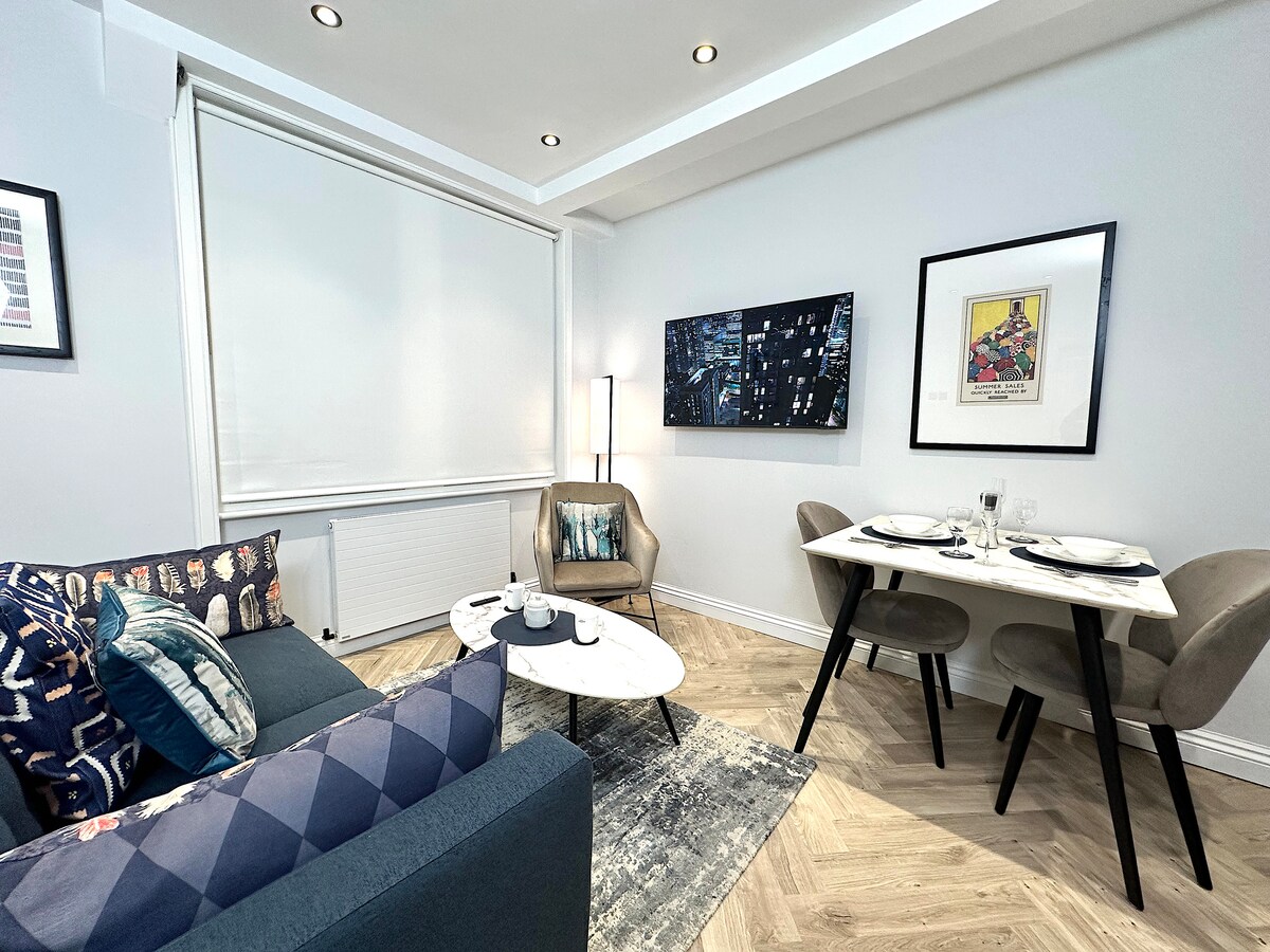 Très central, appartement en sous-sol (45 m²), capacité de 3 personnes. Ne convient pas aux bébés de moins de 2 ans et les enfants comptent pour une personne. Entrée privée, 1 chambre, 1 salon, 1 cuisine, 1 salle de bain. Proche des quartiers commerçants d'Oxford Street, Regent Street et Bond Street, des bars et restaurants de Soho, des musées et des théâtres. Nous avons la fibre la plus rapide du Royaume-Uni, parfaite pour le streaming/stockage cloud. Vous pouvez travailler à domicile avec une connexion sans fil ou filaire disponible dans la zone de bureau désignée.