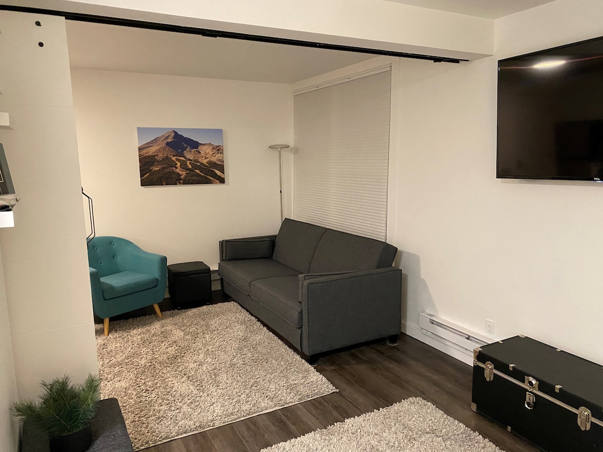 Appartement de ski confortable au premier étage près de la montagne. Profitez de l'intimité de deux chambres, dont une avec un lit queen size et une avec des lits superposés. La cuisine est approvisionnée en produits de base. Les condos de Hill sont pratiques pour la montagne de ski, à distance de marche du centre de conférence et de Mountain Village avec toutes ses commodités. L'appartement offre une entrée sans clé, une chaîne stéréo Bluetooth et des téléviseurs intelligents, sans oublier une belle vue sur Lone Mountain. Il fait 440 pieds carrés et est situé à moins d'un demi-mille du complexe hôtelier.
