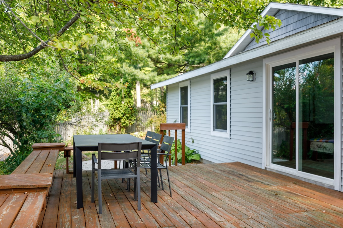 Ce charmant bungalow sur 5 acres est niché le long de 1000 pieds de la rivière Boardman. Nous avons des kayaks, un hamac, un coin repas/salon extérieur avec cheminée et un jacuzzi. La propriété est entourée de terres et de sentiers, parfaits pour la randonnée, le kayak, les side by side et la motoneige. La cuisine est entièrement approvisionnée et contient des condiments de base. La salle de bain dispose de serviettes, d'un sèche-cheveux, de petits articles de toilette et de savons. Le Wi-Fi vous aidera à rester connecté. Parfait pour un séjour en lune de miel ou une escapade en couple ! À 25 minutes de TC.