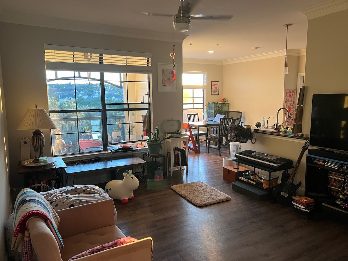Ce studio privé et calme de 800 pieds carrés se trouve au-dessus d'un garage pour 3 voitures. Vue sur le lac Travis depuis la fenêtre de la cuisine et situé à proximité du parc Mansfield Dam, des locations de bateaux et de l'Oasis. Salle de bain complète. La cuisine dispose d'un réfrigérateur pleine grandeur, d'un four à micro-ondes, d'un lave-vaisselle, d'une cuisinière à gaz, de poêles et d'ustensiles. Vous apprécierez la télévision par câble HD et l'Internet haut débit sans fil de 300 Mbps. À 30 minutes du centre-ville. Vous pouvez également vous garer dans le garage ! ASSUREZ-VOUS DE LIRE LE RÈGLEMENT INTÉRIEUR AVANT DE RÉSERVER POUR COMPRENDRE CE QUI EST/N'EST PAS AUTORISÉ.