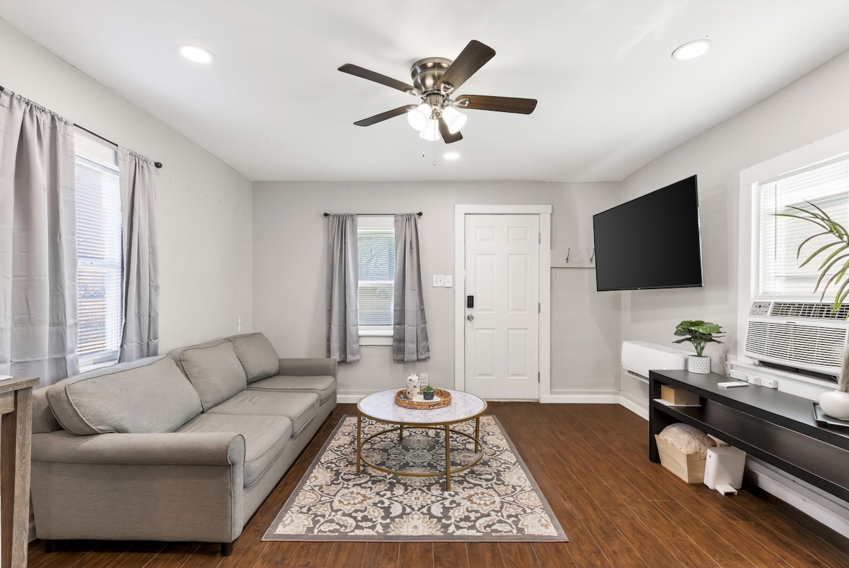 Les voyageurs adorent la commodité et la facilité de cette suite studio moderne avec entrée séparée, portail d'intimité et parking ! Dispose de son propre chauffage et de la climatisation pour que vous puissiez contrôler la température à votre convenance. Cette suite avec entrée indépendante est située au coin de notre maison, il y a une chambre au-dessus, donc vous pouvez entendre des pas occasionnels, le son n'a généralement pas été un problème pour les voyageurs qui ont séjourné ici.
