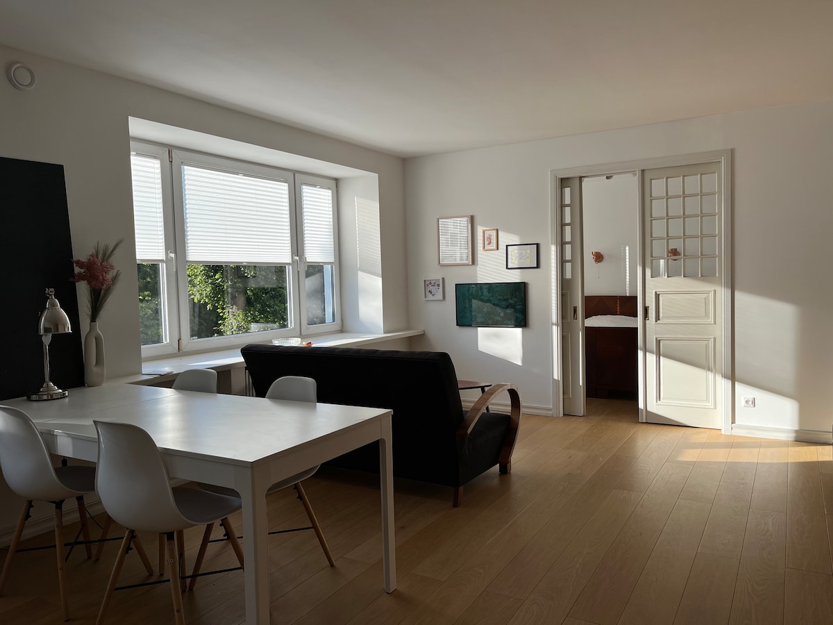 Profitez d'une expérience élégante dans cet appartement situé au centre. Vous séjournerez dans un petit appartement luxueusement rénové contenant toutes les commodités - WIFI, télévision, penderie, cuisine entièrement équipée et une baignoire double et une baignoire double. Vous pouvez passer votre temps à écouter de la musique avec des haut-parleurs HiFi ou lire l'un des livres de notre collection. Dans le quartier, il y a de nombreux restaurants, des parcs et de jolies rues pour se perdre.