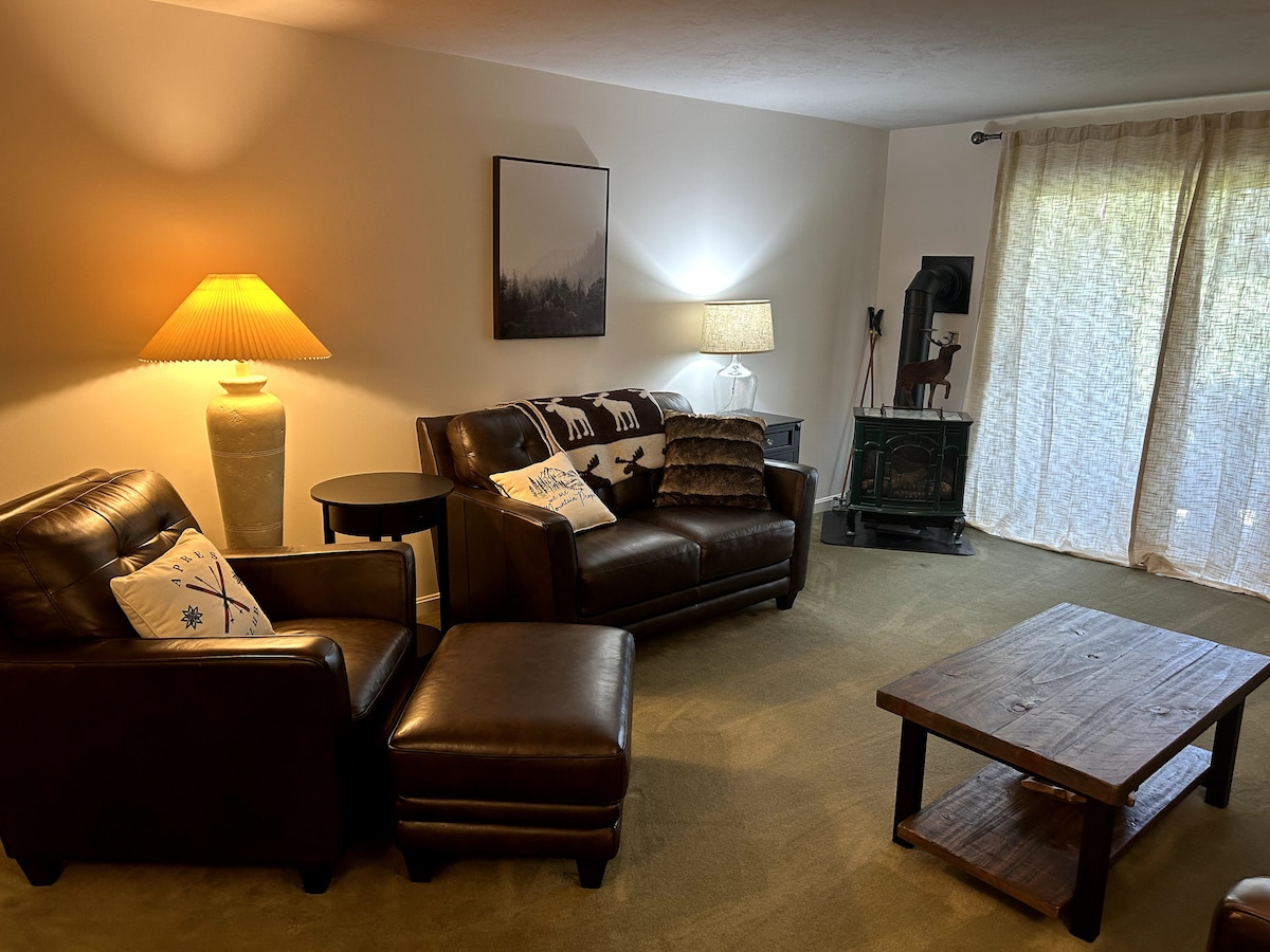 Notre condo est une maison privée de 1er étage à thème rustique qui se trouve le long de la branche est de la rivière Pemigewasset. Accès direct à la rivière depuis notre porche arrière. À une minute en voiture de Loon Mountain et à proximité de nombreuses attractions de la région. Laissez les bruits de la ville derrière vous lorsque vous franchissez notre entrée privée - vous aurez l'impression d'être transporté dans une cabane isolée dans les bois ! Écoutez les sons de la rivière impétueuse et profitez d'une vue imprenable sur la nature depuis chaque pièce (vue sur la montagne en hiver).
