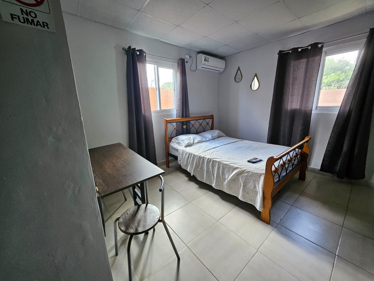 Détendez-vous avec toute la famille dans ce logement calme et confortable pouvant accueillir jusqu'à 6 personnes. Il dispose de 2 chambres avec lit queen et canapé-lit queen dans le salon, de la climatisation dans les chambres et le salon, de 2 salles de bains avec eau chaude, du Wifi, de la télévision par câble, de Netflix, de Prime dans le salon et dans la chambre principale, d'une grande cuisine, d'un salon-salle à manger, d'une buanderie complète. Il est situé à seulement 7 minutes de David, à 20 minutes de Boquete et à proximité des rivières et des piscines. Nous acceptons les animaux de compagnie moyennant un supplément de 40 $.