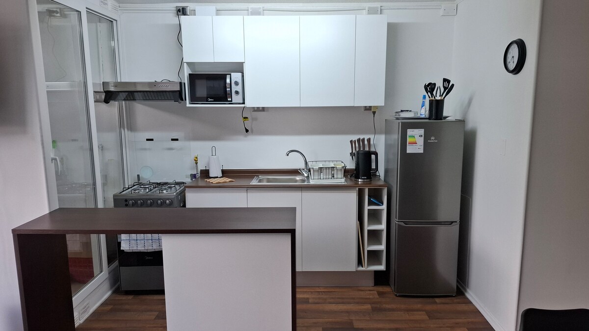 Confortable, moderne et confortable, appartement avec une chambre, cuisine américaine, concierge 24 heures sur 24, parking, comprend la climatisation, lave-linge, deux téléviseurs, Internet Wi-Fi, chambre avec lit double, dans le salon il y a un futon 1 place, parfait pour les couples avec enfants (il est au premier étage), capacité deux adultes et deux jeunes enfants, ou trois adultes, avec accès direct à la cour et cuisine équipée. Référence emplacement au centre Pucón (5 minutes en voiture). Moins de 17 ans pas de frais supplémentaires.