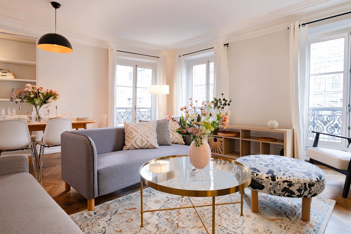 Boasting herringbone parquet flooring, fine furnishings and abundant natural light, this sophisticated 110m2 apartment offers a bright, elegant, warm and luxurious atmosphere. The apartment, with fireplace and moldings, combining charm, calm and comfort is located in one of the oldest passages in the historic center of Paris. This apartment has an official tourist accommodation operating license. So it's perfectly legal.