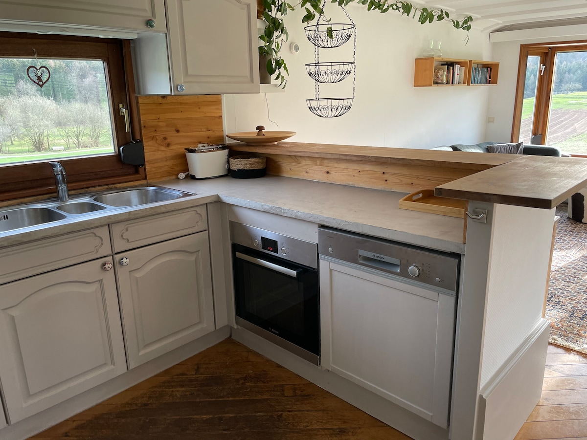 La maison de vacances achevée en 2020 offre sur 57 m ² deux chambres, salon, cuisine avec coin repas, salle de bain + douche à effet pluie ainsi qu'un sauna finlandais (50-70 degrés), un poêle à bois une ambiance qui rend même les jours froids et pluvieux confortables. La vue depuis les fenêtres au ras du sol et de la terrasse de 40 m ² s'oriente sur le grand terrain extérieur et invite à la détente à l'extérieur en contact direct avec la nature. On peut y observer de nombreux animaux. You can contact us in English