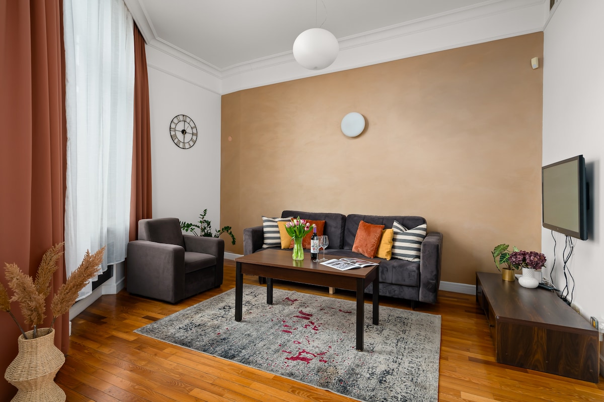 Je vous invite dans un nouvel appartement dans la vieille ville. * Intérieur luxueux décoré par un architecte * Arrivé autonome * Pour 6 personnes : 2 chambres séparées et salon ( 3 lits doubles) 55 m2 * À 20 minutes à pied de la place du marché * Magnifique patio sur le domaine * Wifi gratuit, télévision * Espace de travail * Balcon * Cuisine entièrement équipée * A proximité des commerces : grenouille à l'étage 0, Lidl 150 m * Petits déjeuners Shakshuka 50 m * Parking dans le garage souterrain au niveau -1 - frais supplémentaires