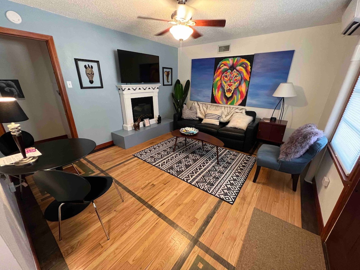 Évadez-vous dans notre oasis romantique d'inspiration africaine à Lubbock ! Détendez-vous dans un luxueux lit king-size, plongez dans la baignoire vintage ou admirez les étoiles depuis le jacuzzi partagé. Profitez de soirées confortables avec une cheminée, une télévision Roku et une connexion Wi-Fi rapide. Situé à seulement 4 minutes de Texas Tech, des restaurants et des magasins. Parfait pour des séjours courte ou longue durée, notre espace magnifiquement conçu comprend une kitchenette, un canapé en cuir et un décor africain. Votre aventure et votre détente vous attendent !