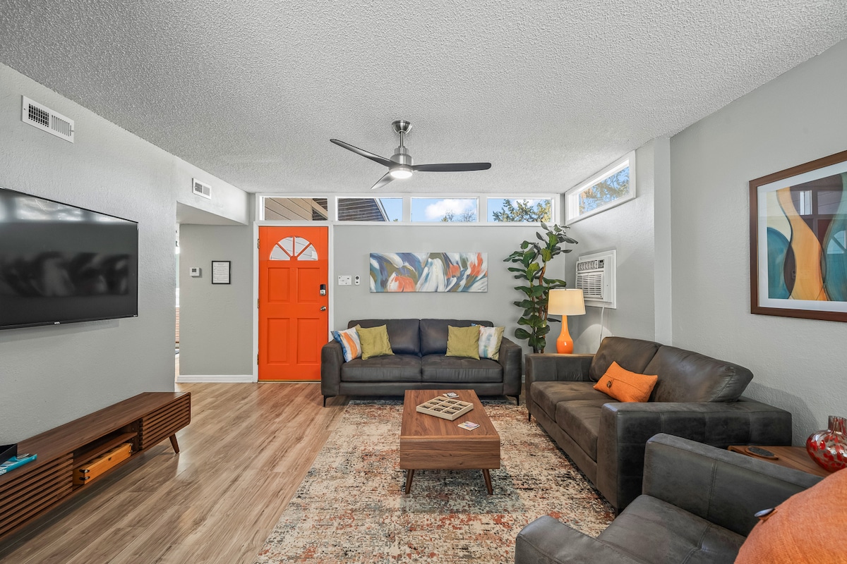 Cette escapade sur le thème Boho est idéale pour les familles et les séjours en groupe ! Doté d'une cuisine complète, d'une connexion Wi-Fi rapide, de deux espaces de vie et d'une télévision connectée 65"(Netflix gratuit, Hulu, Amazon). Récemment mis à jour dans tout le logement avec une atmosphère moderne et fonctionnelle conçue pour que les clients puissent se détendre et se délasser. Belle cour arrière avec de grands arbres, pelouse entièrement clôturée, patio arrière couvert et jeux de plein air, parfait pour recevoir des voyageurs. Au plaisir, nous sommes impatients de vous accueillir !
