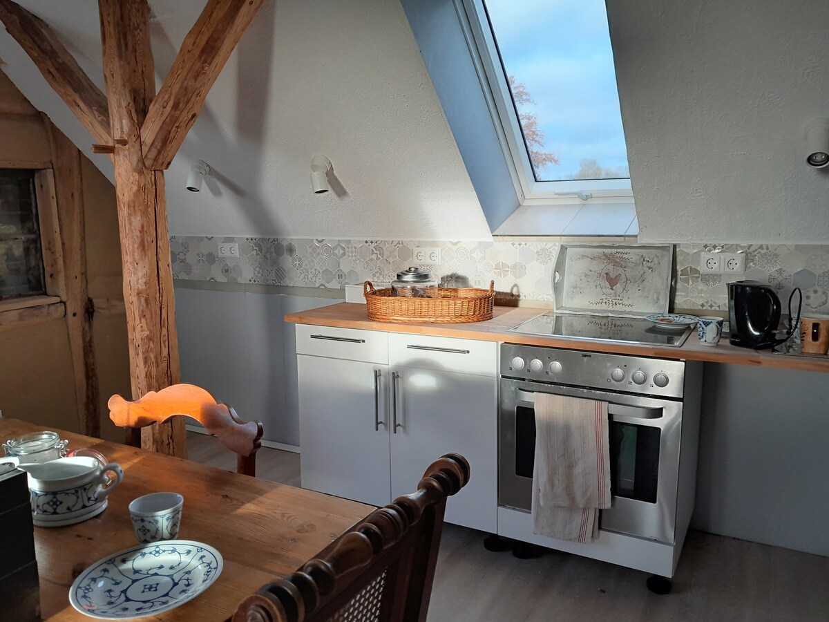 Mitten im Wald, auf einer Lichtung, 3 km vom schönen Ort Gartow entfernt, liegt unser besonderer Rückzugsort. Wer Ruhe und Stille in der Natur sucht und Wert auf Einfaches und Gutes legt, ist hier richtig. Das alte Fachwerkgebäude, ein ehemaliger Stall, wurde hochwertig und nachhaltig mit Naturmaterialien saniert. Lehmputz an den Wänden und der Holzofen garantieren ein hervorragendes Raumklima, der Gang in die holzbefeuerte Sauna verspricht absolute Erholung!