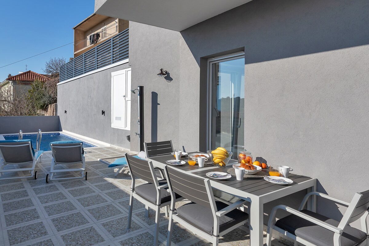 Centrally located Apartment Helene with its position in the city old part has big advantage as its all within walking distance from beach, center, bars and restaurants are just 5 minutes walk . With a private pool and huge terrace equipped with furniture, this two bedroom apartment is comfortably suitable for 4 persons. Apartment consist of 2 bedroom with double bed, living area, and kitchen with dining area and 2 bathroom with shower. We are sure you will love this apartment! WELCOME!