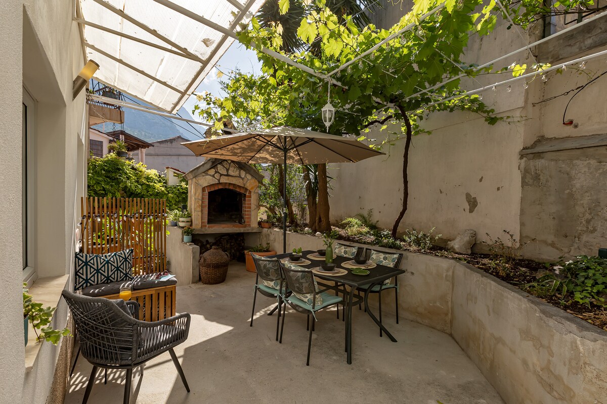 Marineta Suite is situated in the centre of Makarska, directly on the promenade. Completely refurbished in 2021 it's a elegant combination of retro and modern design. Overlooking the marina on one side and the Franciscan Monastery and Biokovo mountain on the other. Two bedrooms, with en suite bathrooms and individual climate control offer privacy and comfort for couple traveling together or families with children. The true gem in this apartment is the backyard with terrace and garden.
