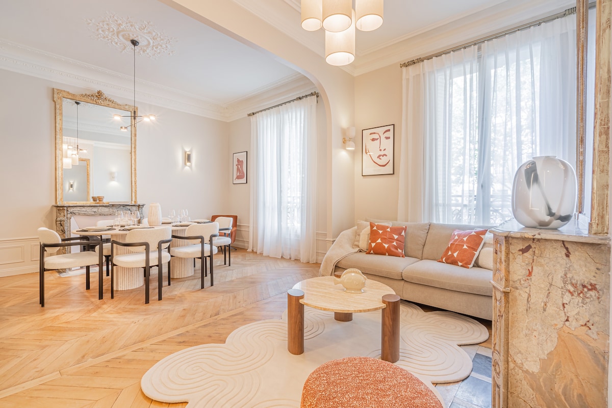 Cet appartement unique de style parisien est situé dans un immeuble de haut standing au cœur du Marais. L'appartement vous est entièrement dédié. Personne d'autre ne sera là pendant votre séjour. Très élégant. Décoré par un célèbre architecte d'intérieur. Parquet, moulures anciennes, cheminée. Super lumineux et confortable. Calme et spacieux avec un immense salon de 40m2. Chefs-d'œuvre de l'art contemporain. Vue imprenable depuis le balcon. Parfait pour les couples célébrant un événement romantique ou un voyage d'affaires.