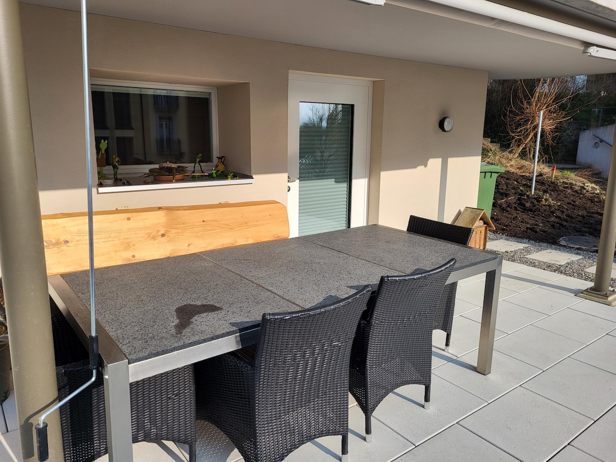 Notre maison d'hôtes est à côté de notre ferme. Elle est à la campagne, mais à seulement 10 minutes en voiture de la ville de Lucerne. Vous avez une vue magnifique sur la montagne Rigi et le mont Pilatus. C'est un appartement neuf et moderne avec une seule chambre et une belle galerie. C'est donc un endroit idéal pour un couple ou une petite famille (pas de chambre séparée !). Dans la salle de bain, il y a une baignoire et une douche. Vous avez une bonne cuisine équipée.