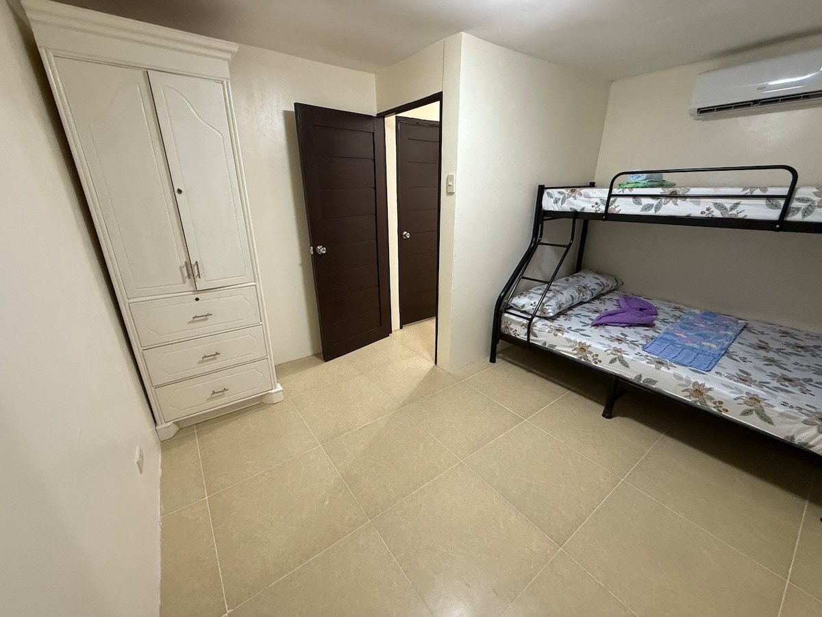 Two-story gated house w/ a garage& a mini porch. Comes with 2 rooms -- room 1 has a queen size bed & room 2 has a double bunk beds. All rooms are w/ split type aircons. The living room area has a smart TV, free WIFI & Netflix access, a sofa set w/ entertainment items (books, board games, stationaries & pens). The kitchen is w/ new & complete appliances (Ref, electric kettle, toaster, rice cooker, induction stove & pots. Kitchenware & utensils are also provided. The rest room is with heater.