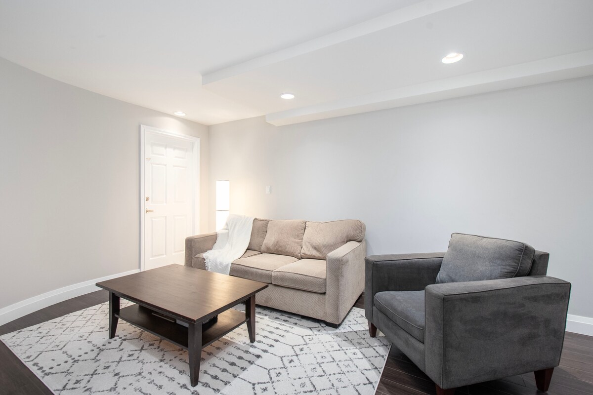 Suite privée au sous-sol d'une BR dans une maison nouvellement construite. La suite dispose d'une cuisine complète, d'une entrée privée et d'une salle de bain complète avec douche/baignoire combinée. Appareils électroménagers : buanderie dans la suite, four et cuisinière pleine grandeur, micro-ondes, réfrigérateur et lave-vaisselle. Animaux de compagnie et enfants bienvenus ! Lit king size dans la chambre séparée avec dressing. Canapé convertible double dans le salon. Équipement pour bébé disponible. À proximité des commerces et du célèbre parc Lynn Canyon. Remarque : il s'agit d'une suite en sous-sol. Reg'n H335588166