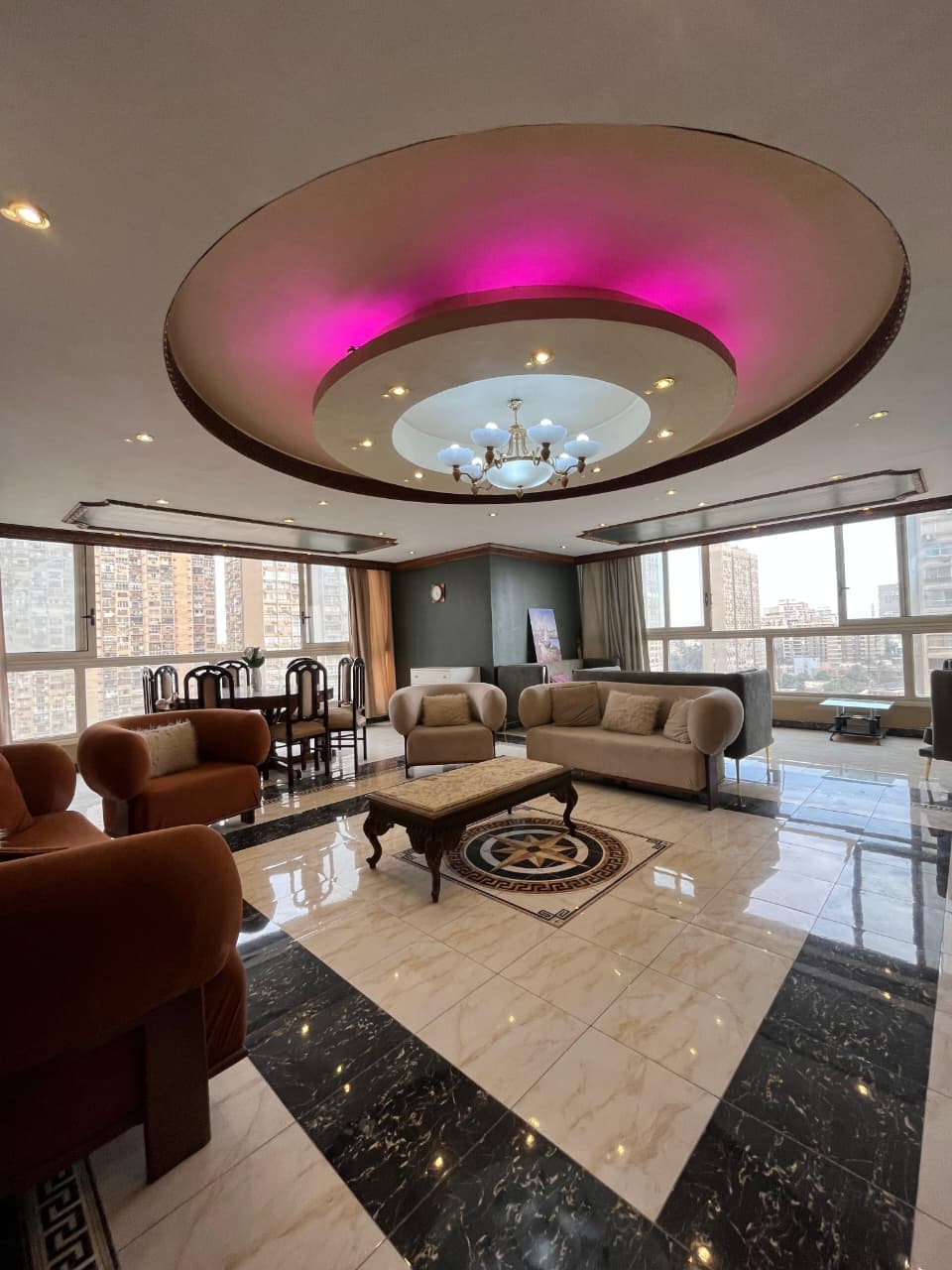 Profitez d'un séjour luxueux dans un appartement spacieux de 4 chambres, situé en plein cœur de la corniche de Maadi, au sein d'une prestigieuse tour résidentielle de 42 étages équipée d'ascenseurs à grande vitesse. Situé au huitième étage, cet appartement offre une vue latérale agréable sur le Nil et constitue un espace idéal pour les familles, les groupes de même sexe et les longs séjours.