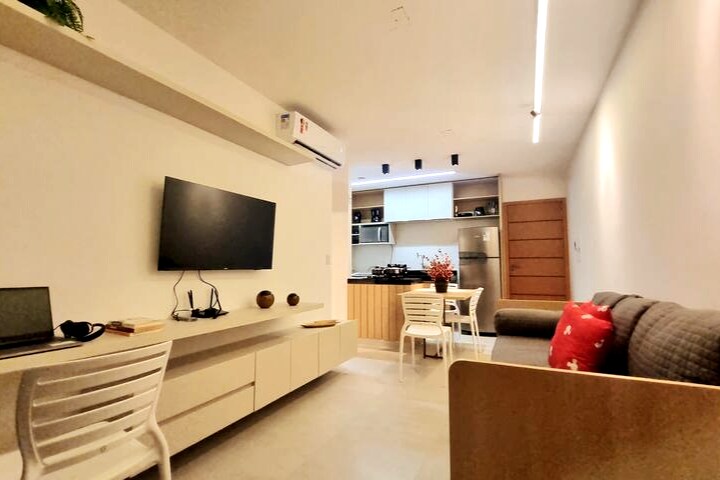 Appartement avec salon avec climatisation split, balcon, 2 chambres (1 suite) les chambres avec climatisation split, salle de bain, salle à manger, cuisine, buanderie avec machine à laver, se trouve au 3ème étage, 3 ascenseurs entièrement meublé avec smart TV dans le salon et dans la suite, canapé-lit, wifi 250 mega nous fournissons des draps et des serviettes, deux places de parking. L'espace loisirs avec piscine, salle de sport, barbecue est sur le toit avec une belle vue sur le front de mer. L'électricité est facturée 1,0 real pour chaque 1 kWh.
