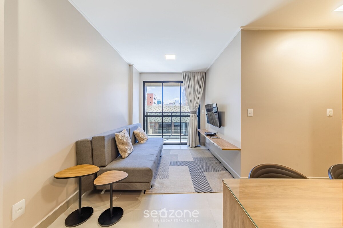 Bienvenue à Loft Residence 505, une retraite moderne de 40 m² en bord de mer à Maceió. Le loft combine un design sophistiqué et un mobilier conçu pour offrir confort et style. Le téléviseur 55" pivote à 360°, vous permettant de vous détendre tout en regardant depuis le canapé ou le lit. Sur le balcon, ouvrez la fenêtre en verre et laissez la brise et le bruit des vagues accompagner votre petit déjeuner, ou profitez simplement de la vue infinie sur la mer. Situé à proximité des plages, des restaurants et des attractions de Maceió.