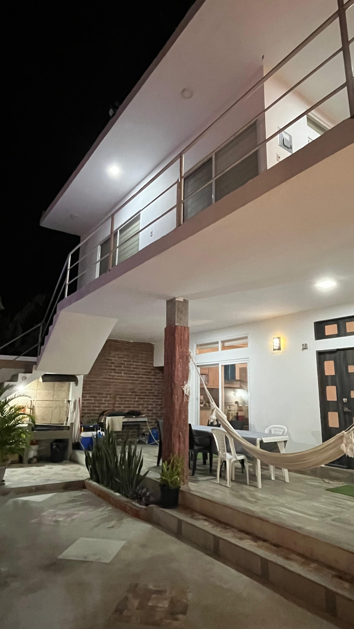 Casa playera, segura y cómoda dentro un cerramiento con dos otras casas y con salida directo al mar. Acesso a piscina, jacuzzi, area de hamacas y fogata al pie del mar. 7 camas en 3 habitaciónes para hasta 12 huéspedes. Salida directo al mar Acceso a Piscina y jacuzzi comunales Chosa con hamacas al pie del mar Área barbeque privado Wifi Agua caliente Aire acondicionado en dos de las tres habitaciones. Corto caminata a tiendas y restaurantes.