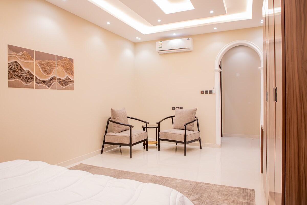Profitez de cette élégante résidence avec toute la famille. Appartement moderne de luxe * Conçu et équipé pour votre confort * Il s'agit de deux chambres (Master / et une chambre avec 3 lits) Un salon spacieux ouvert sur la cuisine moderne Design élégant (écran Samsung Smart WiFi) Cuisine entièrement équipée - Réfrigérateur - Four + micro-ondes + lave-linge - Tous les accessoires de cuisine complets- - Cuisinière (gaz/électrique) En plus de l'emplacement privilégié 8 minutes en voiture de la gare 10 minutes en voiture de l'aéroport 5 minutes en voiture de la mosquée Quba 15 minutes en voiture de la mosquée du Prophète