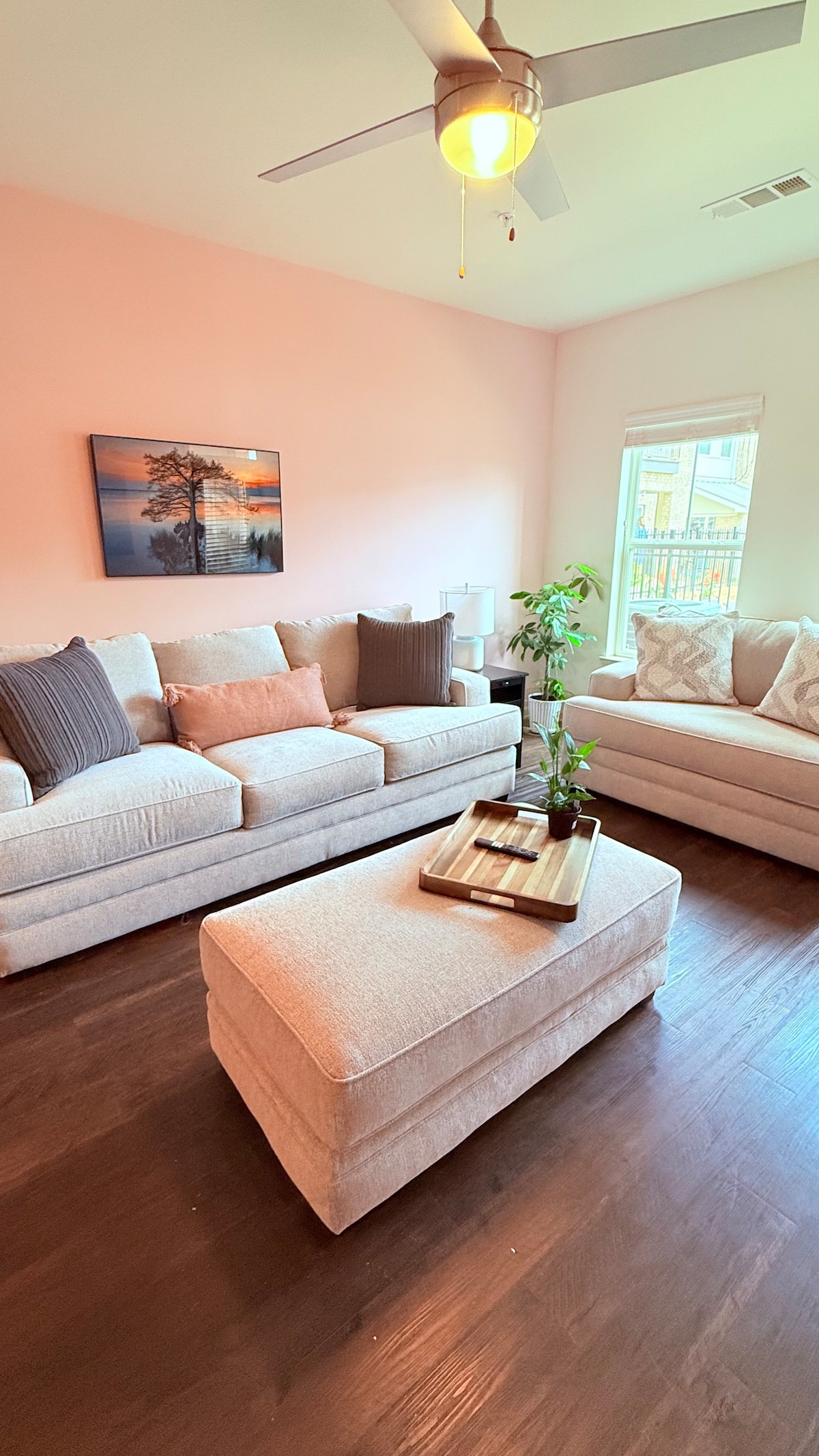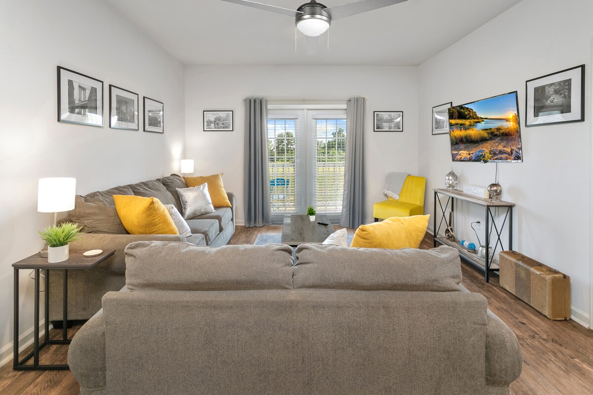Our 2-bedroom 2-full bath apartment is furnished with a King bed in the primary room and Queen bed in secondary room with 43' smart TVs in both bedrooms. The common space has a 50' smart TV, dining table for 4, love seat, and 2 accent chairs. It has everything you need for a comfortable stay! The kitchen is stocked with cookware for meals, coffee, and tea maker to enjoy a fresh cup of coffee or tea. Anything in the apartment is yours to use. Make yourself at home once you arrive.