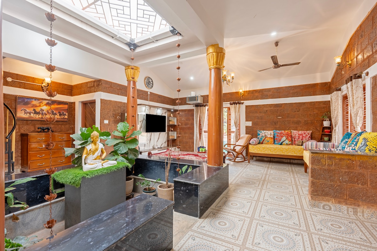 Parvati, une maison confortable d'une chambre qui offre une expérience complète avec tous les équipements dont vous avez besoin pour passer un séjour agréable. Que vous soyez en voyage d'affaires ou en vacances, c'est une escapade paisible au cœur de Bangalore, alliant confort moderne et charme de la nature. Entourée d'un jardin luxuriant avec un porche privé, la maison est conçue avec un thème antique, avec un puits naturel, un charmant lit à baldaquin et un décor vintage qui crée une atmosphère chaleureuse et accueillante.