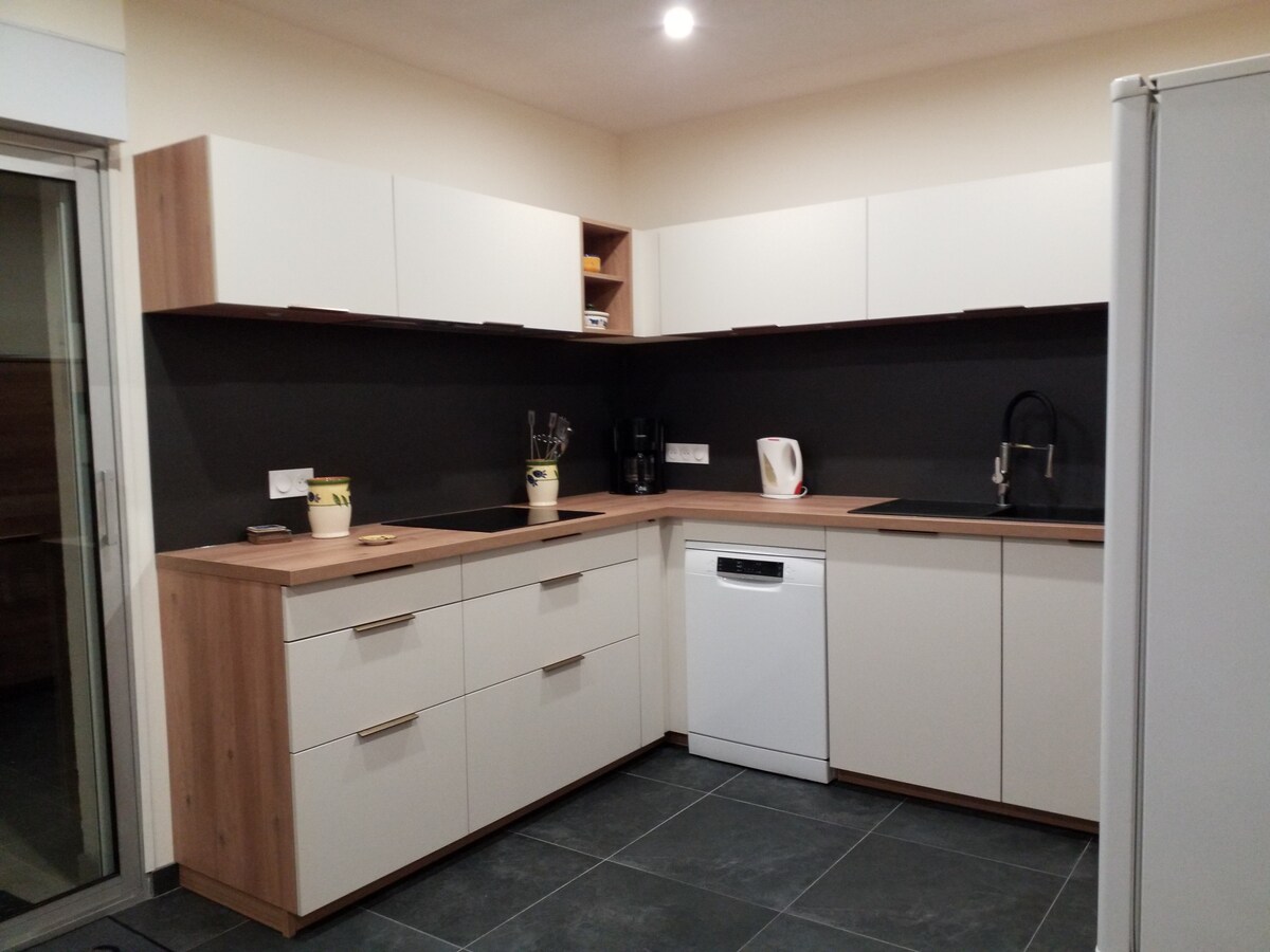 Loft de 110 m2 composé de deux chambre avec lit double 160x200 (drap et serviette fournie), salle d'eau , salon, salle a manger. La cuisine propose tous les équipement nécessaire ( micro ondes réfrigérateur congélateur four plaque a induction lave vaisselle cave a vin ) cour extérieure avec petit coin bar évier plancha coin détente avec transat au bord de la piscine privée chauffée et sécurisée sans vis a vis. entre mer et montagne. Plages 20min. les fetes et le tapage nocturne sont interdit