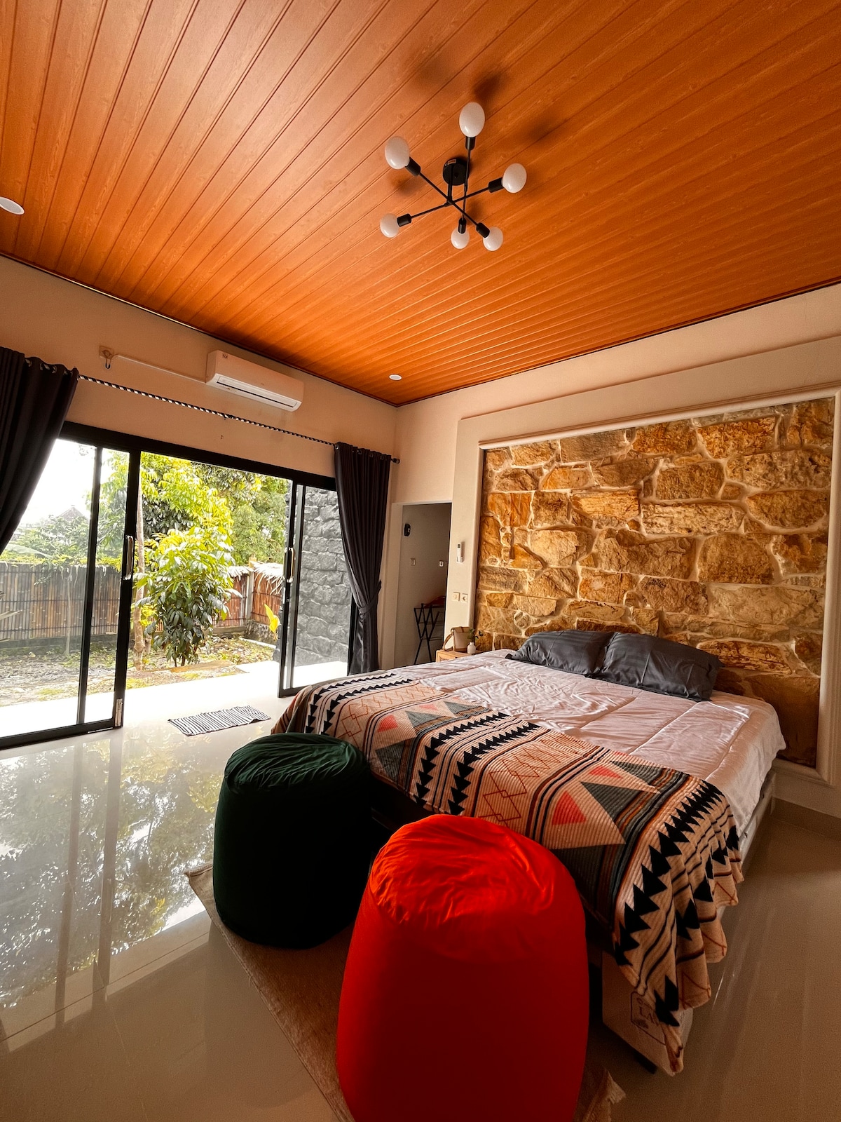 Villa en pierre unique avec intérieur de style bohème. Conçu pour vivre pieds nus confortablement. - chambre principale : lit King Size - salon minimaliste + canapé-lit - Cuisine avec appareils électroménagers, cuiseur à riz, réfrigérateur, couverts et ustensiles à boire, et collection de thé - salle de bain avec un petit jardin semi-extérieur avec une cascade artificielle pour se baigner. (Siège de toilette, il y a du savon et du shampoing) - Terrasse donnant sur le jardin arrière - Sac à haricots - Cour avant spacieuse avec portail, sûre pour le stationnement des véhicules