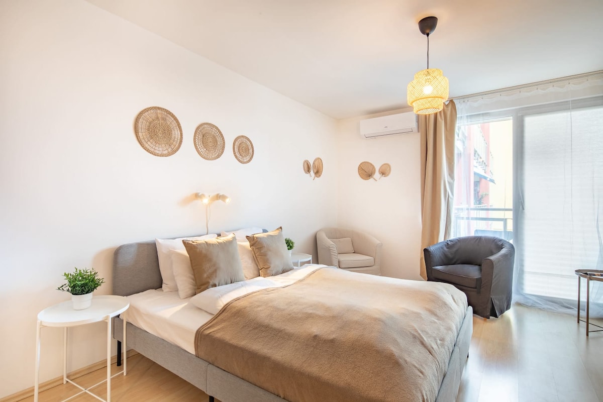 Profitez d'un séjour élégant et confortable dans ce studio récemment rénové, parfait pour une escapade en ville ou un voyage d'affaires tranquille. Détendez-vous avec Netflix, cuisinez dans la cuisine entièrement équipée ou travaillez au bureau dans la galerie romantique avec un lit queen confortable. Situé à seulement 5 min du parc János Pál pápa et du métro 4, et à 13 min de la gare de Keleti. Entrée sécurisée par carte à puce, parking sur demande et taxe de séjour déjà incluse.