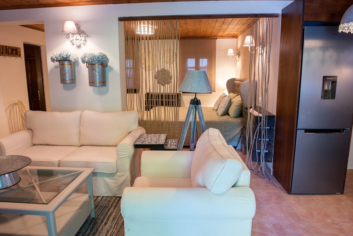 La Villa Erifili s'étend sur deux niveaux. Au premier niveau se trouve le salon spacieux, la cuisine entièrement équipée et une grande salle de bain avec douche. Un escalier en bois mène à l'étage où se trouvent les trois chambres et une autre grande salle de bain. L'accès à la cour verte est possible depuis les deux étages. À l'extérieur, il y a un four traditionnel en bois couvert de pergola et une salle à manger avec une table en bois. Autour de la petite piscine il y a des chaises longues.