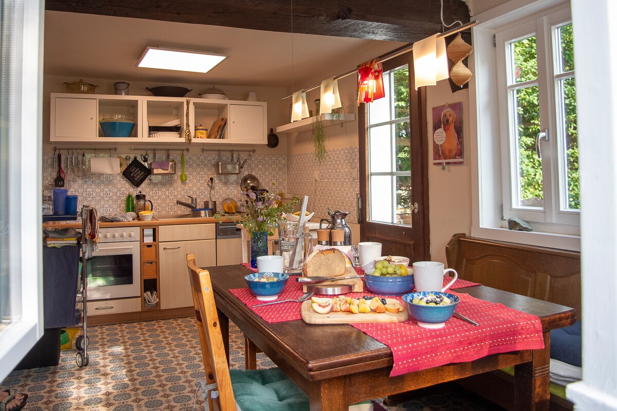 L'appartement avec entrée séparée se trouve dans la maison voisine. Il est dans un endroit très calme, mais bien relié à Francfort, Fulda et Aschaffenburg. Il est important pour nous que vous vous sentiez chez vous et que vous vous accordiez une pause dans votre vie quotidienne. Notre appartement est confortable et équipé de haute qualité. Nous accordons une grande importance à la propreté et à l'hygiène, et nous facturons donc également des frais de nettoyage généraux de 35 €, les draps et les serviettes propres sont inclus.