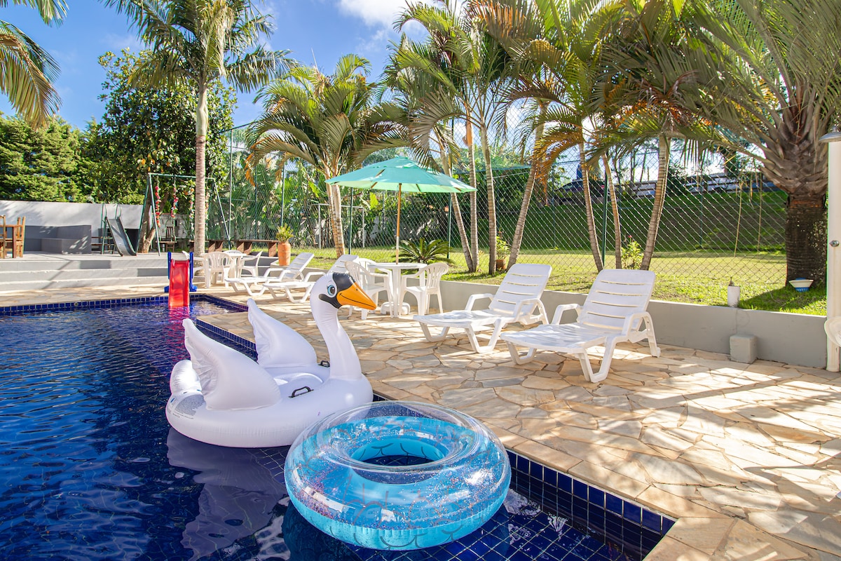 Chåcara complÚte à l'intérieur de la co-propriété Porta do Sol avec sécurité 24h/24, une grande maison avec une vue spectaculaire, piscine, court de tennis, court de tennis de plage, terrain de football, salle de sport, cheminée extérieure, salle de jeux, barbecue spacieux avec cuisine équipée, balançoire sans fin, terrasse en bois avec table et canapé, pergola avec chaise longue double. Tout cela dans la ferme, qui est un espace privé. Espace de loisirs privé complet. à 5 min de la sortie Catarina.
