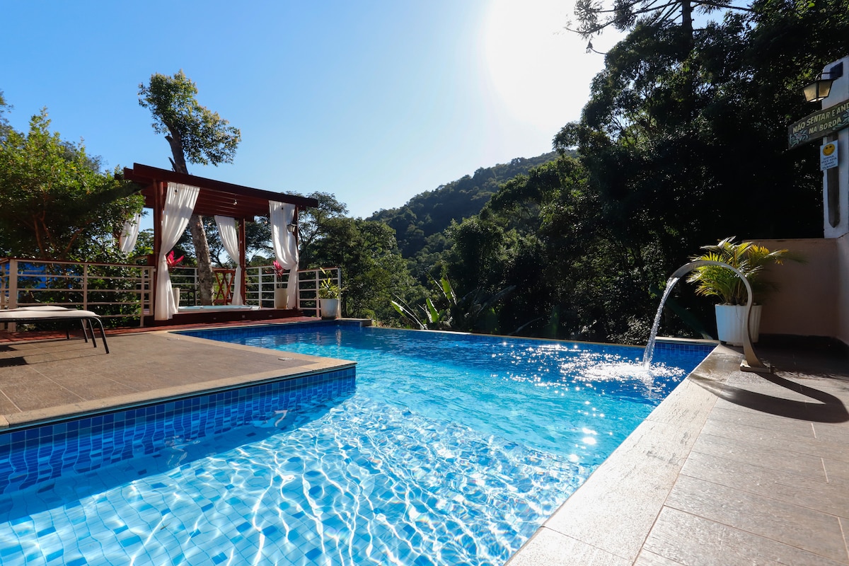 Avec une baignoire pour six personnes, la Casa da Ponte propose un contact direct avec la nature, avec des murs et des plafonds en verre pour que vous ayez le vert à l'intérieur de la maison avec beaucoup de sécurité et de confort. Réveillez-vous avec la rosée du matin et la lumière entrant par le mur de verre géant, en écoutant et en observant les animaux de la forêt atlantique comme si vous dormiez sous un arbre, mais dans un lit King avec une couette très chaude et la cheminée chauffant la chambre. Venez vivre cette sensation.