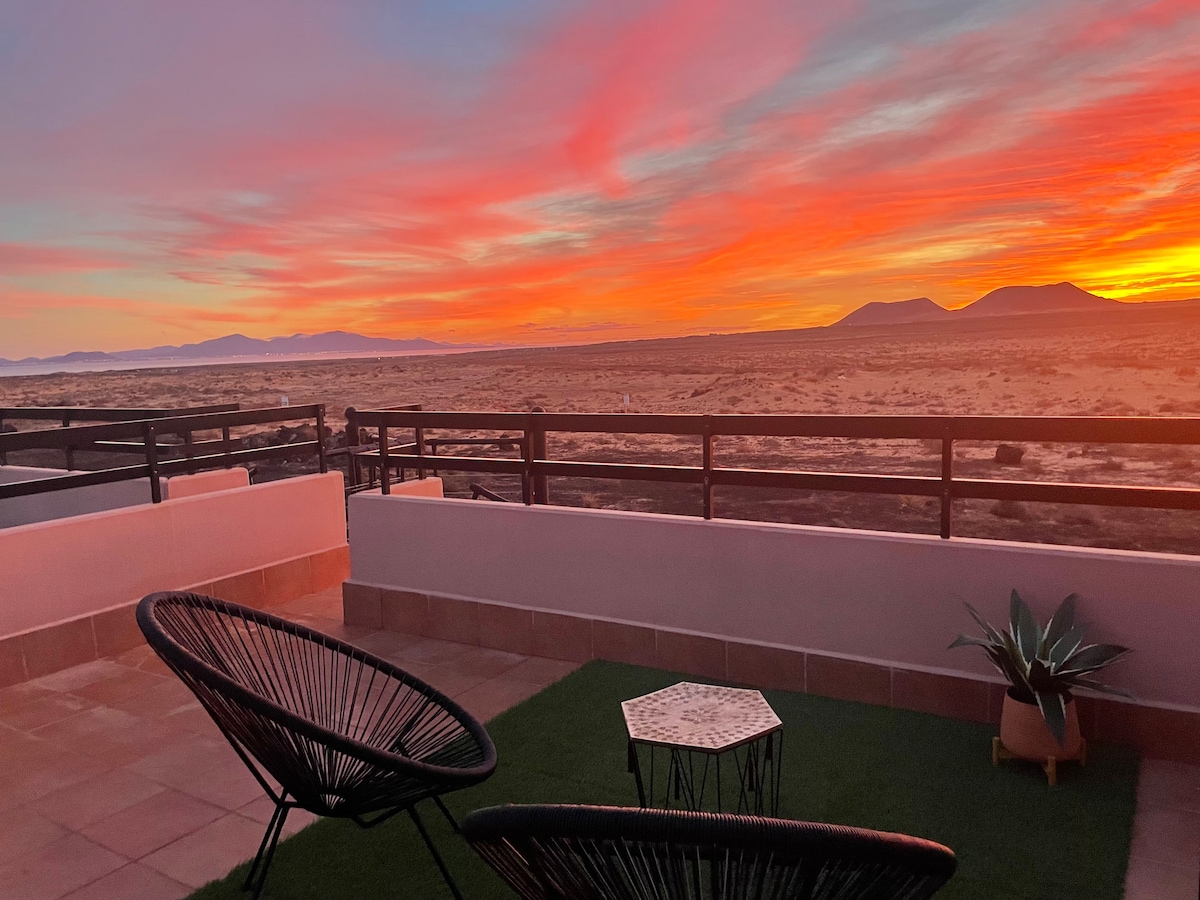 Ocean Breeze L'hébergement qui te fera sentir comme chez toi et sur un bateau flottant dans la mer, grâce à ses belles et grandes fenêtres, tu profiteras chaque jour d'un lever de soleil incroyable avec vue sur la mer et les îles (Lanzarote et Lobos) où, le balcon te permettra d'en profiter tout en buvant un café. L'emplacement est idéal, à la fois dans un quartier calme où vous entendez la mélodie unique des vagues et en même temps à proximité de tous les restaurants, bars et magasins de Corralejo.